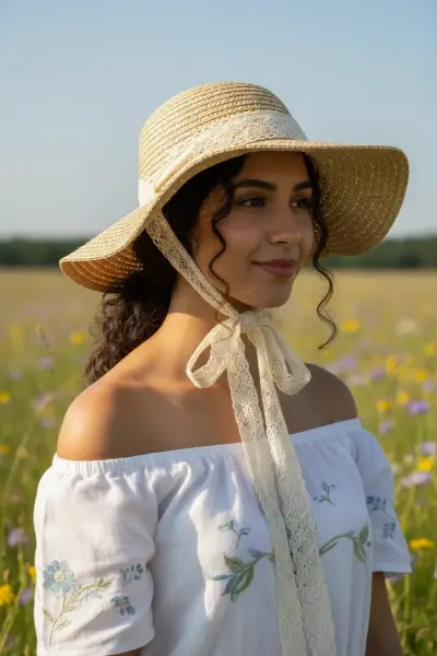 Göz Alıcı Dantel Detayı: Şapkanın gövdesini saran ve çene altından fiyonk yapılarak bağlanan ekru renkli geniş dantel şerit, tasarıma vintage ve feminen bir hava katar.