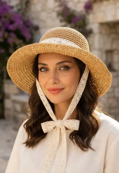 Yaz stilinize romantik bir dokunuş katacak bu özel tasarım hasır şapka, klasik "bonnet" formunu modern el örgüsüyle buluşturuyor. Geniş ve kavisli siperliği ile yüzünüzü güneşten korurken, zarif dantel bağlama detayıyla size sofistike bir görünüm kazandırır.