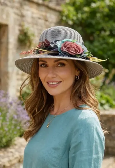 Özel Çiçek Aranjmanı: Şapkanın kenarında yer alan ve özenle seçilmiş renklerden oluşan (gül kurusu, petrol mavisi ve sonbahar yaprakları) büyük çiçek buketi, şapkaya feminen ve vintage bir hava katar.
