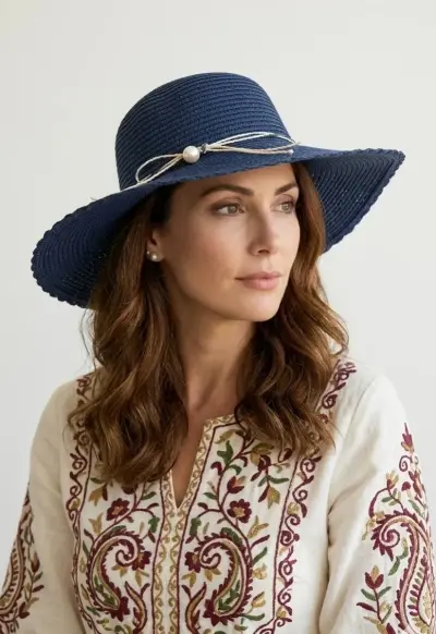 Yazın derinliğini yansıtan lacivert tonu ile klasik ve modern tasarımı bir araya getiren bu plaj şapkası, tatil stilinize sofistike bir imza atıyor. İnce hasır örgüsü ve zarif inci aksesuarıyla hem plajda hem de sahil davetlerinde tüm gözler üzerinizde olacak.