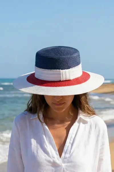 Yaz aylarının vazgeçilmezi plaj şıklığını, Bay Şapkacı kalitesiyle tamamlayın! Lacivert, beyaz ve kırmızının enerjik uyumunu taşıyan bu özel tasarım plaj şapkası, tatil kombinlerinizin yıldız parçası olmaya aday. Düz tepe tasarımı (boater stili) ve püskül detaylı beyaz şeridiyle hem modern hem de zarif bir duruş sergiler.
