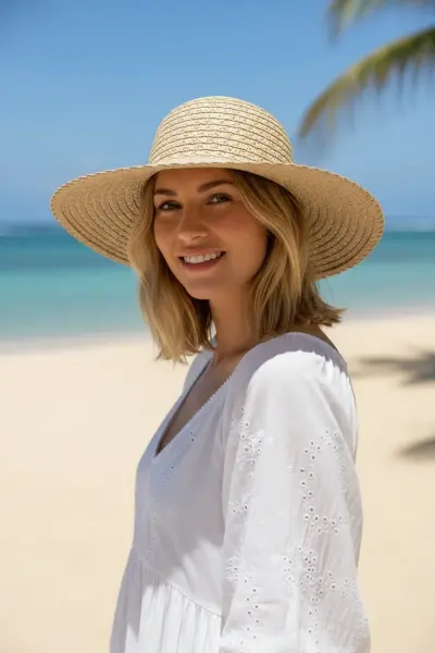 Zamansız bir klasik olan lacivert, krem, kahve,beyaz rengini, özel örgü dokusuyla birleştiren bu plaj şapkası, stil sahibi kadınlar için tasarlandı. Hem sofistike görünümüyle hem de yüksek koruyuculuğuyla güneşli günlerin en güvenilir ve şık eşlikçisi olacak.