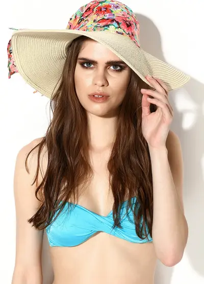 Şapka: Geniş kenarlı, çiçekli kumaş kaplamalı tepe kısmı, standart beden.