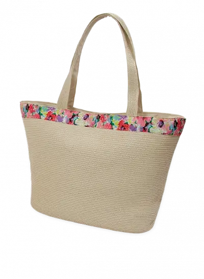 Çanta: Büyük boy plaj çantası, üst kısmı çiçekli şerit detaylı, sağlam omuz askılı.