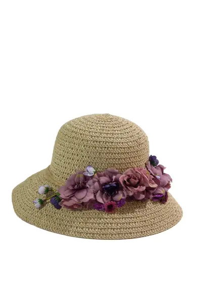 Zarif Detaylar: Şapkayı çevreleyen mor, mürdüm ve lila tonlarındaki gerçekçi yapay çiçek aranjmanı, size adeta bir yaz perisi havası katar.
