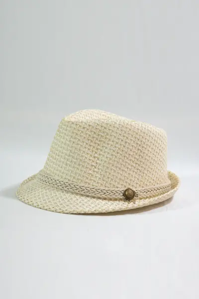 Özel Detay: Şapkanın etrafını saran krem rengi örgü şerit ve üzerindeki antik görünümlü metal düğme detayı, tasarıma sofistike bir hava verir.