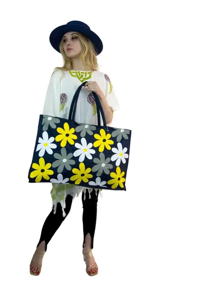Kadın Plaj Çantası ve şapka takım lacivert 2175 - BAY ŞAPKACI