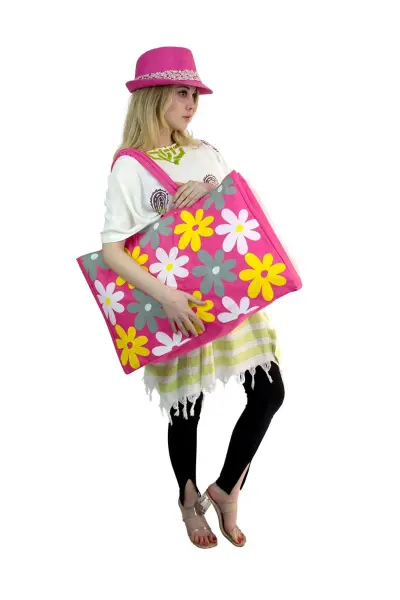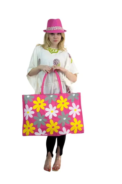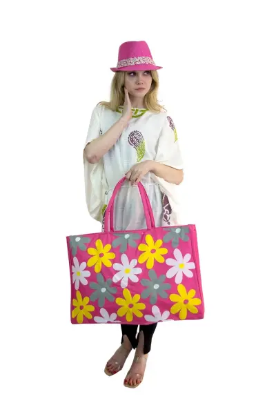 Kadın Plaj Çantası ve şapka takım pembe 2175 - BAY ŞAPKACI